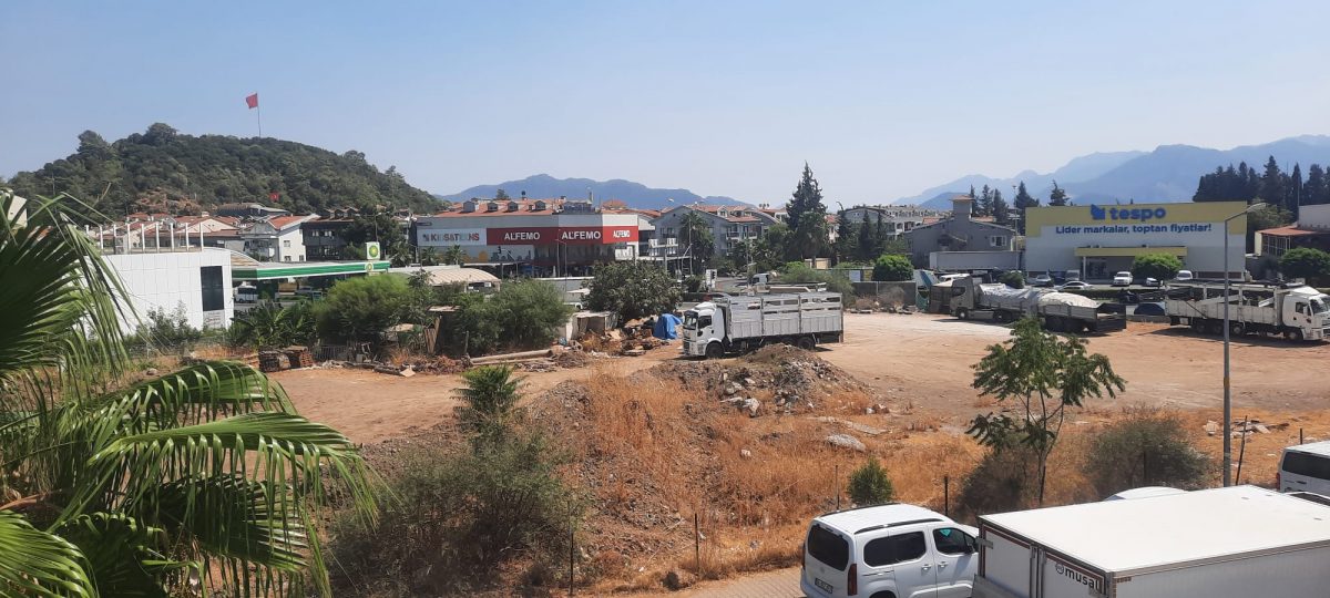 Yeni Datça Yolu üzerinde bulunan, Marmaris Belediyesi binasının yapımından beri kullanılan yaklaşık 7,5 dönümlük arazi, toprak hafriyatının döküm sevkiyatı ve değişik inşaat malzemelerinin depolama alanı olarak kullanılırken, şantiye görüntüsü veriyor.
