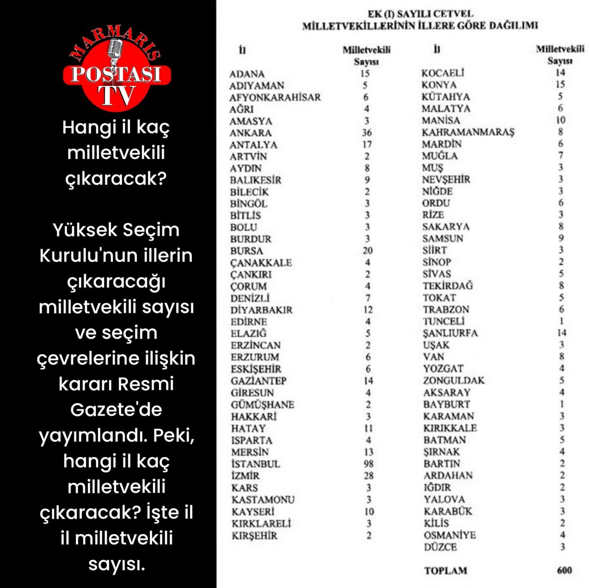 Kararda, deprem bölgesindeki milletvekili sayılarının değişmediği görülürken, 81 ilinin toplamda 600 milletvekili çıkaracağı vurgulandı.
