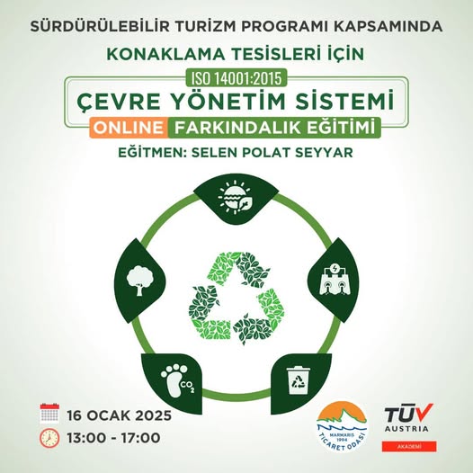 Eğitim, Türkiye Sürdürülebilir Turizm Programının en önemli kriterlerinden biri olan çevre yönetimi alanında; ‘Çevre Yönetim Sistemi’ nedir, sistemin kuruluş açısından kapsamı nasıl belirlenir çevre politikası, çevre amaçları ve bunlara ulaşmak için planlama gibi başlıkları içerecek ve Eğitim 100 kişi ile sınırlıdır. Eğitime son kayıt 15.01.2025 olup eğitim katılım linki eğitim günü gönderilecek. Eğitim sonunda katılımcılara online sertifika verilecek.